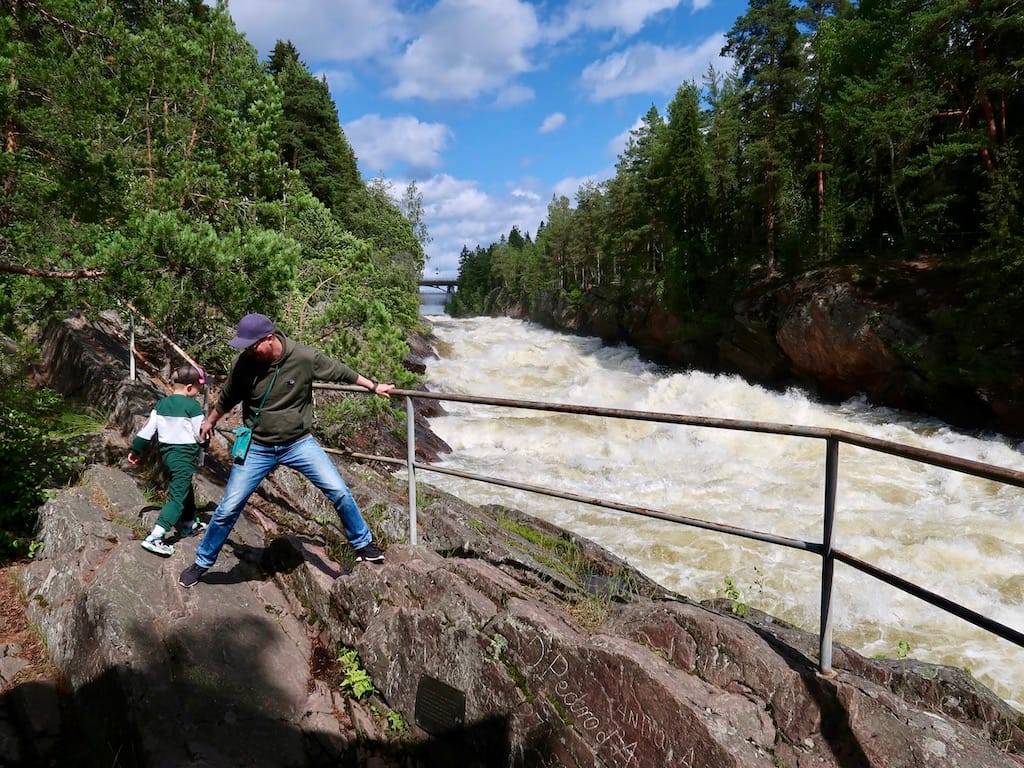 Grænsebyen Imatra ligger ved Vuoksielvens Imatrankoski vandfald. De omtales i Kalevala, fra slutningen af 1700-tallet blev de et yndet mål for turister, og i 1929 blev de tæmmet af Fortums vandkraftværk. Normalt genåbnes vandfaldene kun kortvarigt, men under vores besøg flød de døgnet rundt, fordi der var reparationsarbejde på kraftværket. Slisker udenom opdæmningen gør det muligt at flåde tømmer på elven.