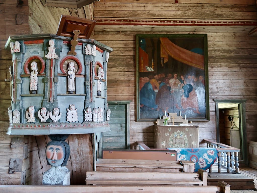 Den tjæreduftende trækirke i Petäjävesi er opført af lokale bygmestre i 1700 og 1800-tallet. Vi fik en vidende introduktion til den velbevarede kirke af to unge kvinder. De viste os den store dørnøgle og fortalte om gudstjenester, hvor menigheden sad opdelt efter køn og social status. Vi så håndværkernes initialer i træværket og en fint udskåret Skt. Kristoffer, som står under prædikestolen. Kirken er velbevaret kulturarv og en levende religiøs institution, der havde netop været bryllup.