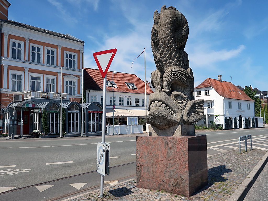 The monument shows respect for Svendborg’s maritime traditions, and the fantasy animal with features from both whale and fish is well placed by the harbour.