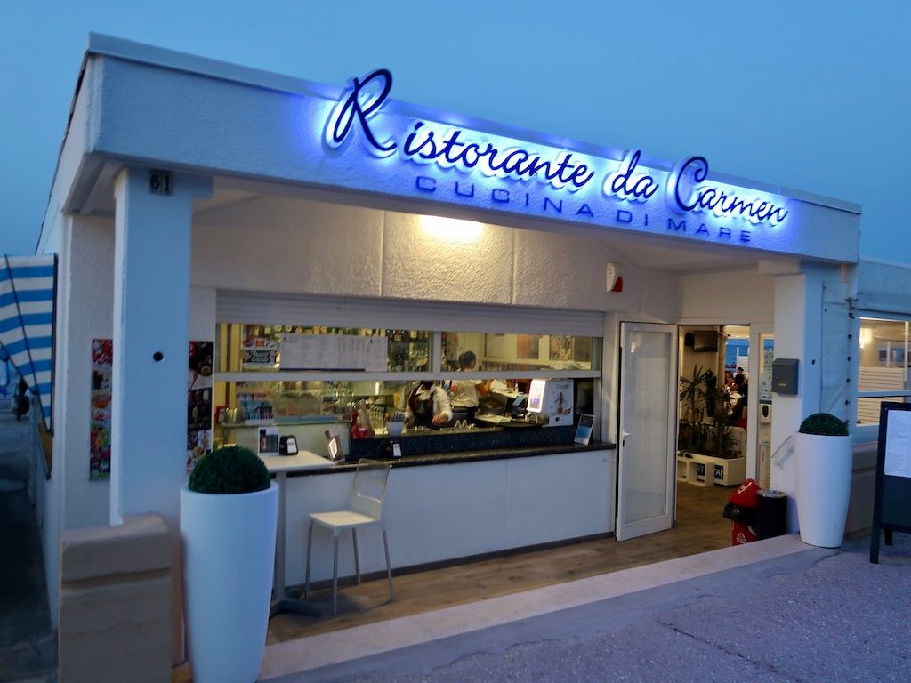 During a short stay in Senigallia, our camping neighbours were welcoming Italian families on a beach holiday. A restaurant with a view served a delicious menu of fresh sea food.