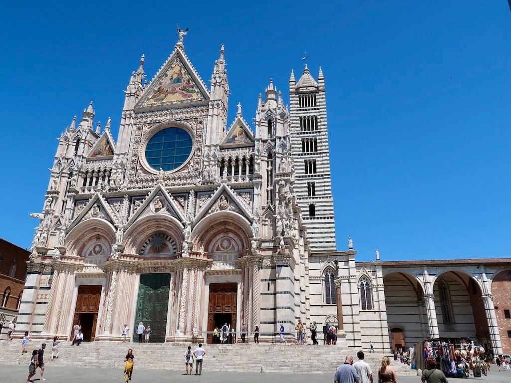 The plague meant that the original plans to build the world's largest cathedral in Siena remained a beautiful Gothic-Romanesque torso with stripes of black and white marble. The church honours Virgin Mary. Its floor is adorned by mosaics with mythological and biblical motifs, the reliefs of the pulpit tell the life story of Christ.
