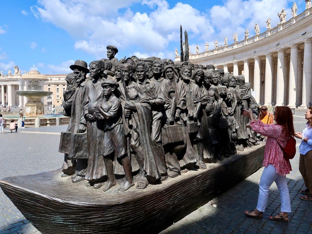 Kort efter regeringens tiltræden afviste den at lade skibet Ocean Viking med 234 flygtninge og migranter anløbe en italiensk havn. Efter diplomatisk tovtrækkeri endte skibet i franske Toulon. Et fotografi af trængslen om bord mindede os om en skulptur, vi havde set på Peterspladsen.